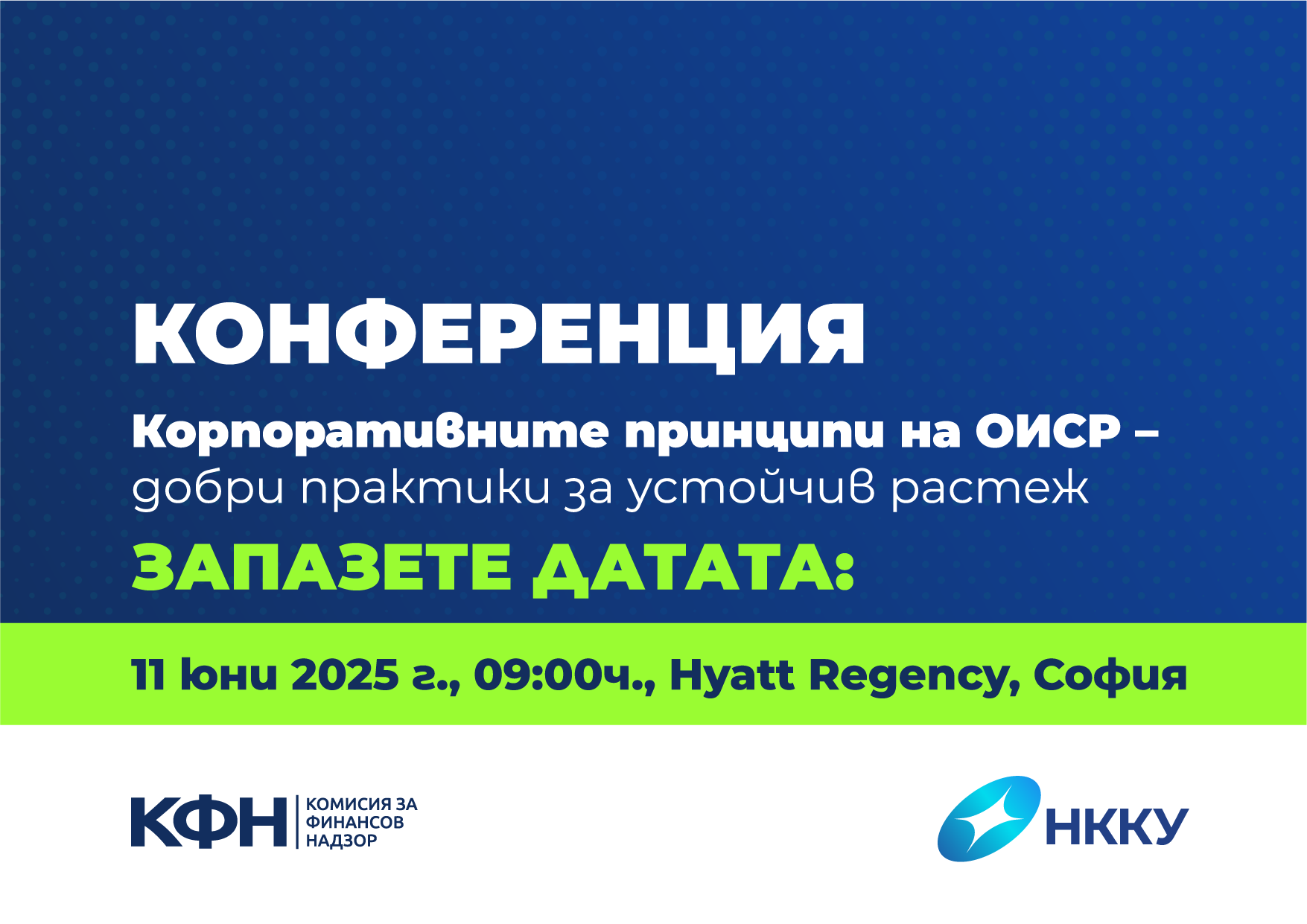 Комисията за финансов надзор и Националната комисия по корпоративно управление организират конференция на тема „Принципи за корпоративно управление на ОИСР/Г-20 – добри практики за устойчив растеж“, която ще се проведе на 11 юни 2025 г.